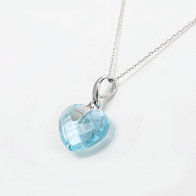すっきり鮮やかなブルートパーズのペンダント。 ハートの上にのったプレートがアクセントです。 チェーンは40センチ。 ハートの大きさ 縦×横=10×13ミリ カットのきれいなストーンです。 品質保証書付き K18 参考小売価格 ¥38000