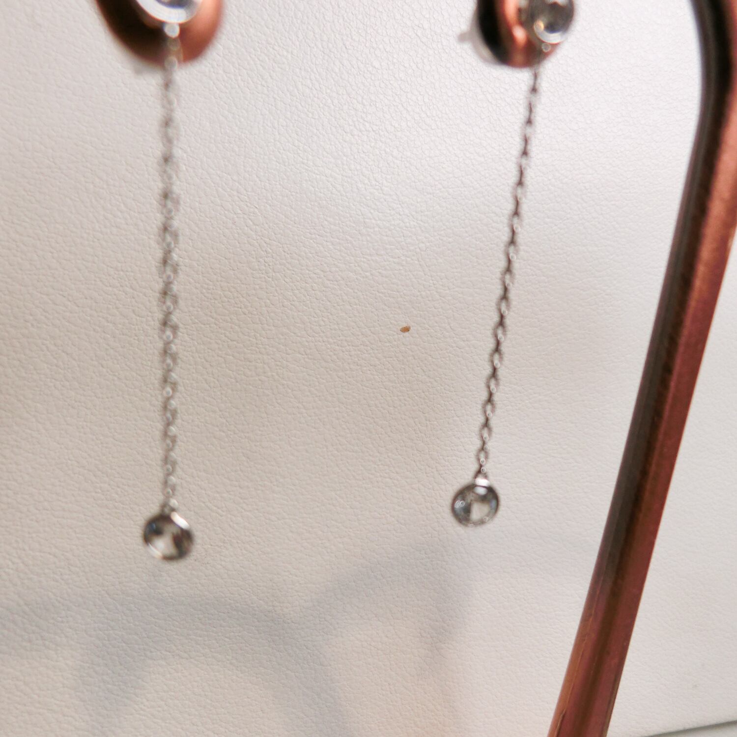 ホワイトサファイヤのピアス ダイヤモンドのようなホワイトサファイヤのついたピアス。 ホワイトゴールドとイエローゴールドがあります。 耳もとに1個とそれから3㎝下にも下がっていてとてもきれいです。 参考小売価格 ¥36000