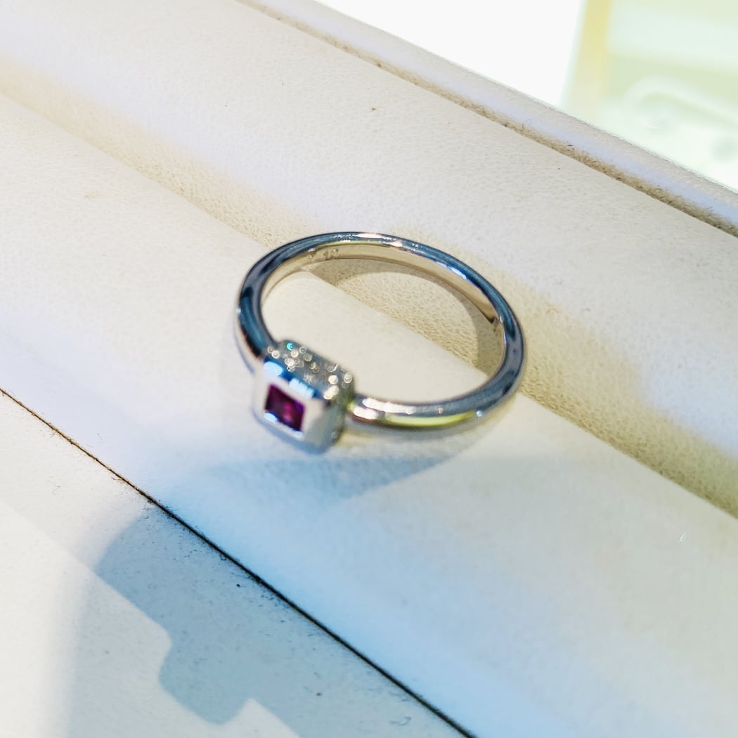 甘すぎず、大人可愛い印象のスクエアルビーリング。プラチナ素材を使用し、品質も高く仕上げました。